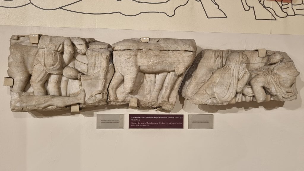 Müzede sergilenen ve fotoğrafta da gördüğünüz mermer kabartma, Yunan mitolojisinin en dokunaklı ve insani sahnelerinden birini gözler önüne seriyor. Eser, hepimizin yakından tanıdığı ve Troya Savaşı’nın sonuna doğru yaşanan bir trajediyi tasvir ediyor: Troya Kralı Priamos’un, oğlu Hektor’un cansız bedenini geri almak için Akhilleus’a yalvarışını.